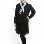 65cm×65cmの小判スカーフで、アスコットタイのようにシャツやブラウスの中におさめて使うこともできます。室内でも巻いたままでいられるので使いやすくなっています。