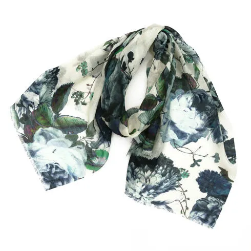 極細のカシミヤ糸を織り上げた、ふわっと軽く光沢のある極上素材。コントラストの効いた美しい手刺繍。風合い、デザイン共に他にはない一枚に仕上がっています。