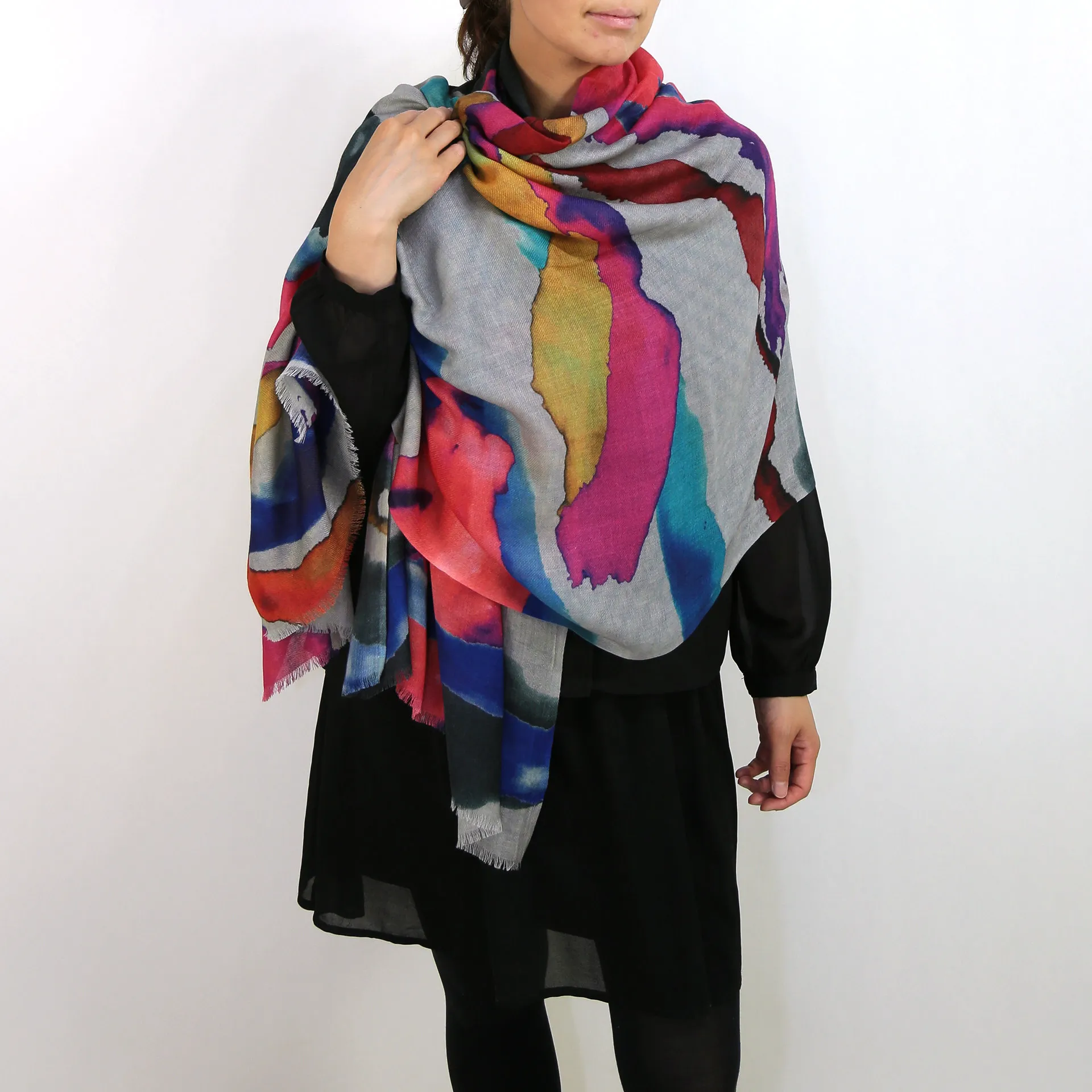 スタンダードな大判サイズで、巻きだけでなく羽織でも使いやすいタイプです。特に羽織は上半身をすっぽりと覆えるため、ファッション全体の印象を大きく変えてくれます。