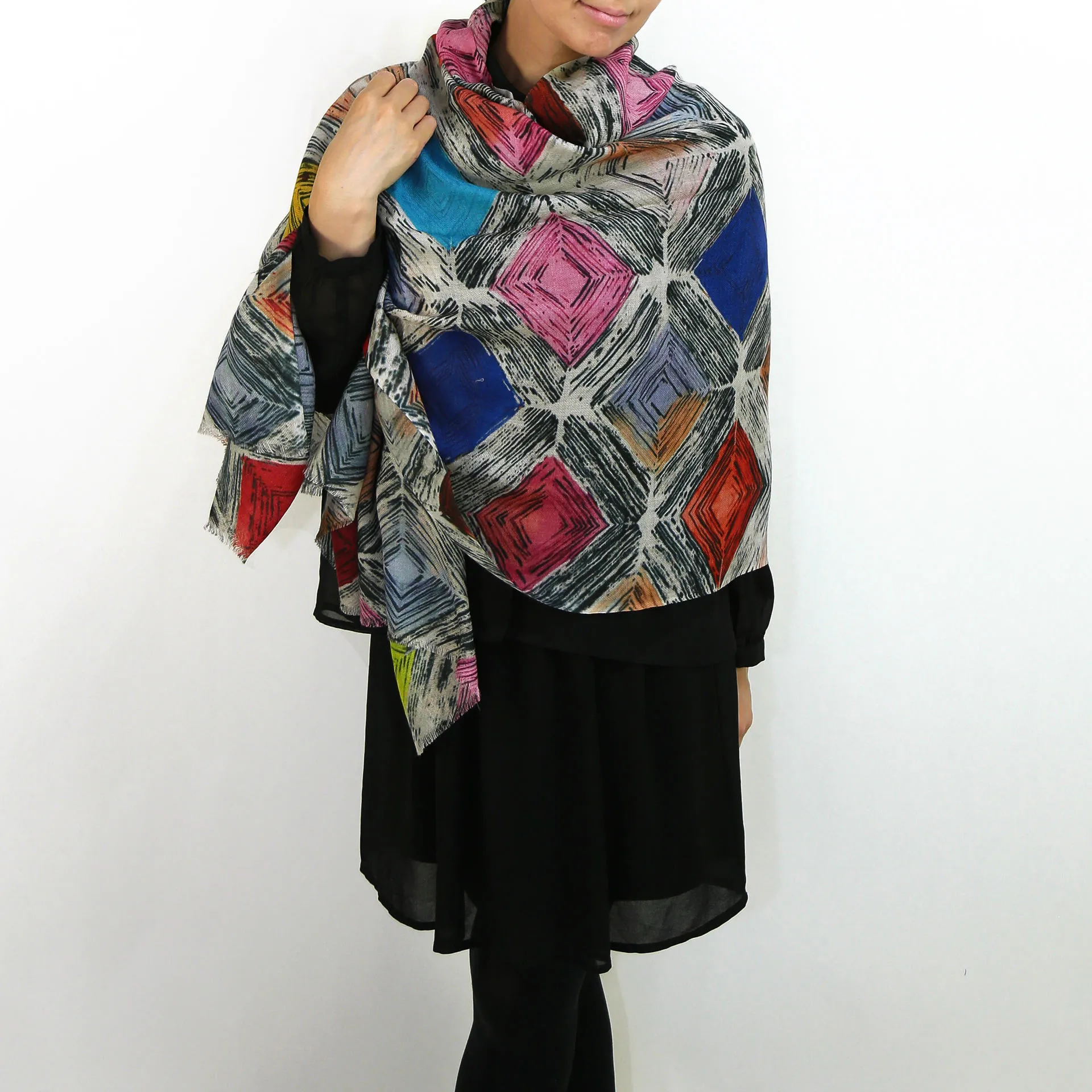 スタンダードな大判サイズで、巻きだけでなく羽織でも使いやすいタイプです。特に羽織は上半身をすっぽりと覆えるため、ファッション全体の印象を大きく変えてくれます。