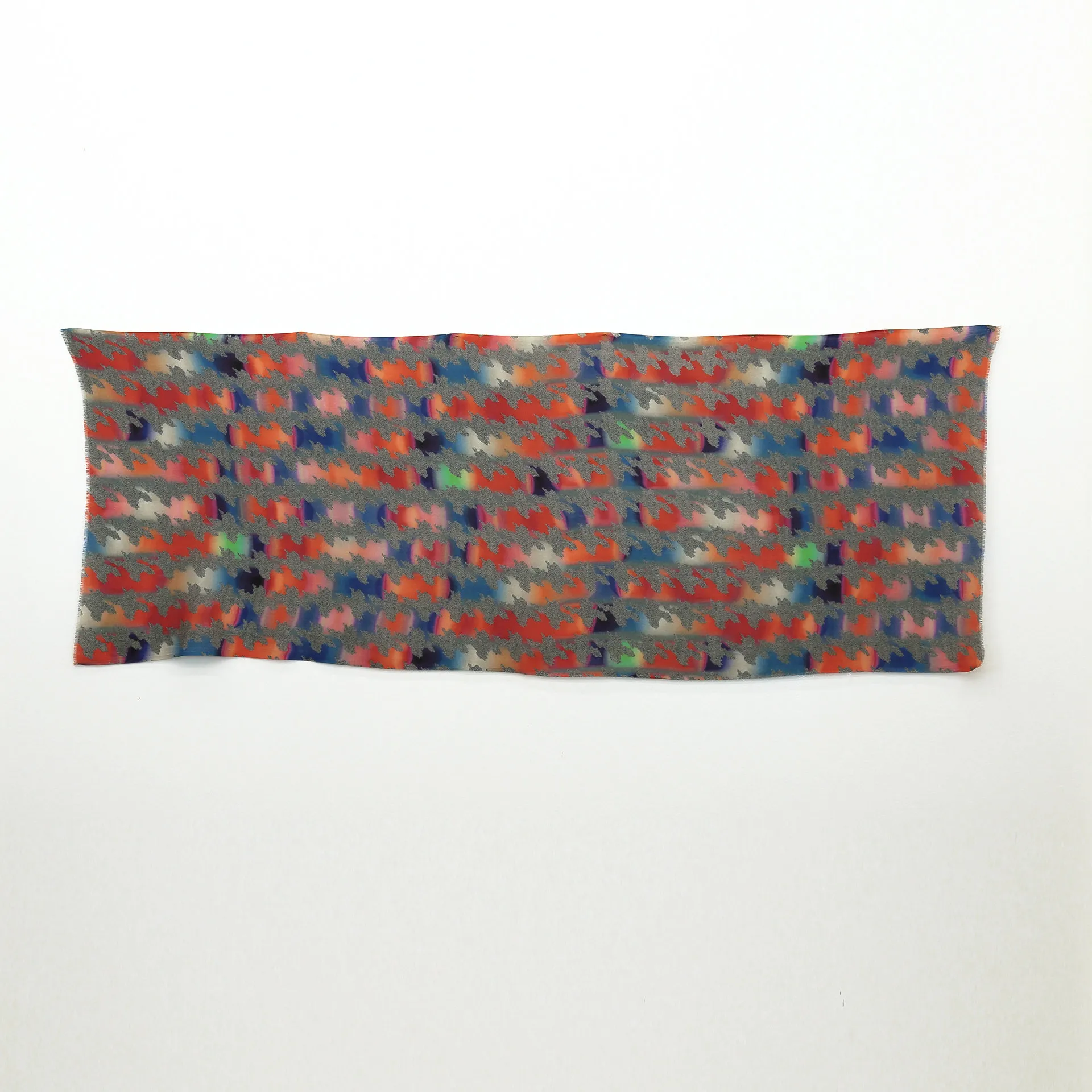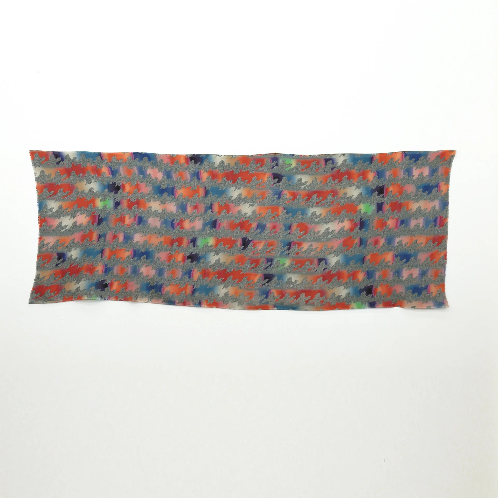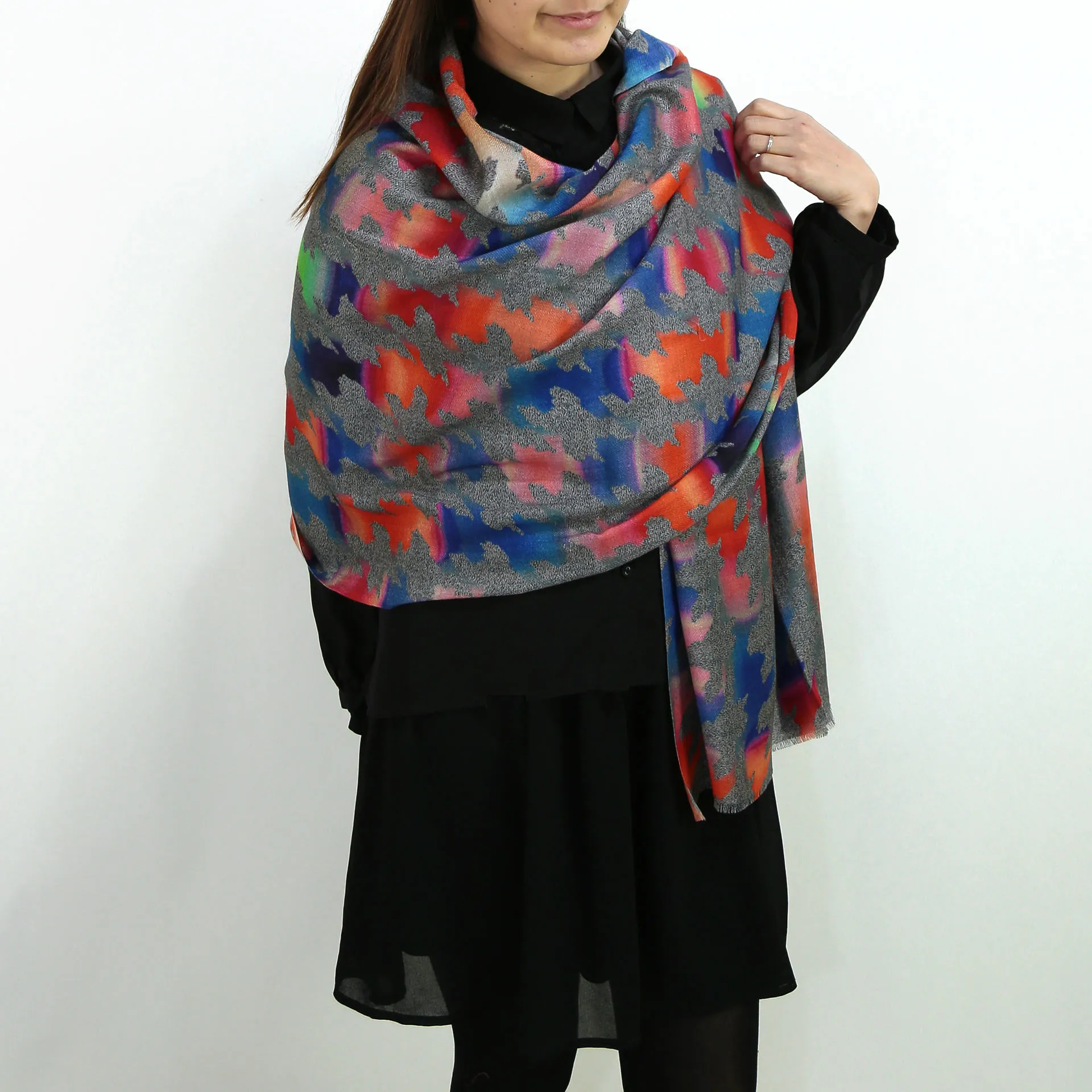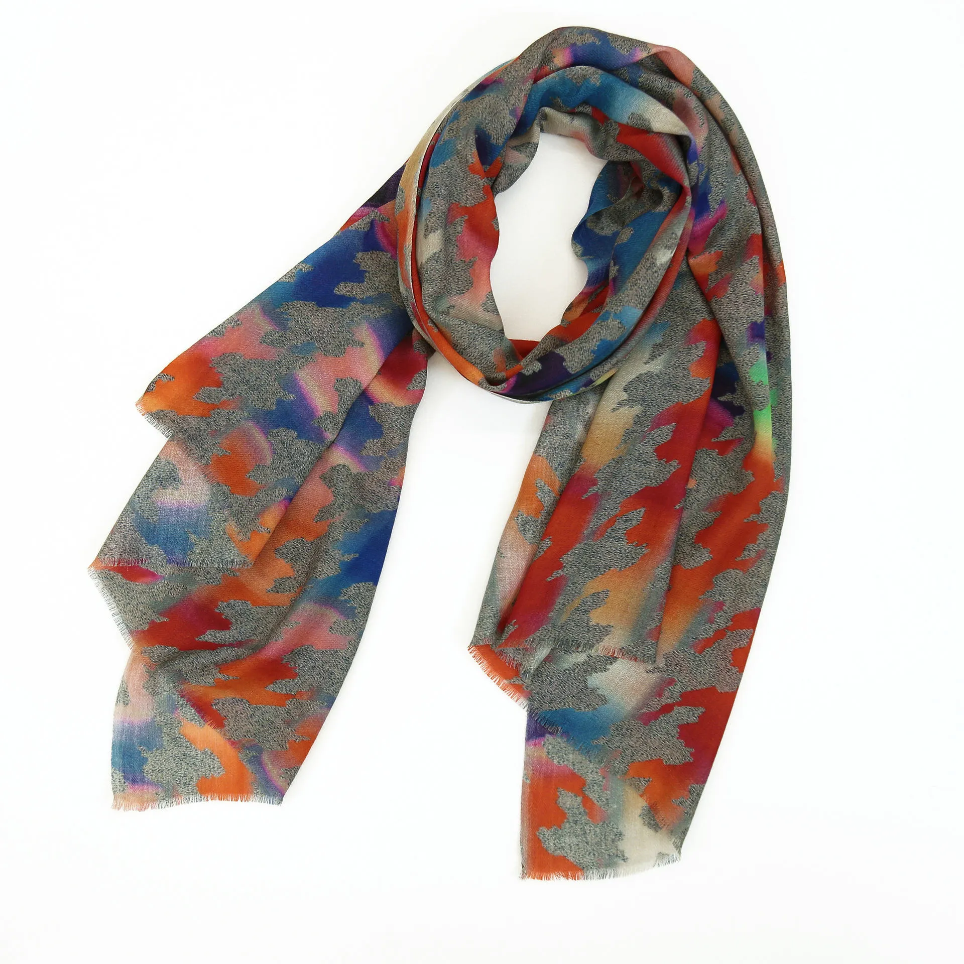 色と柄を掛け合わせてアクセントをつけた、大人の遊び心をくすぐるデザイン。こんなストールがあるとカジュアルは面白くなります!