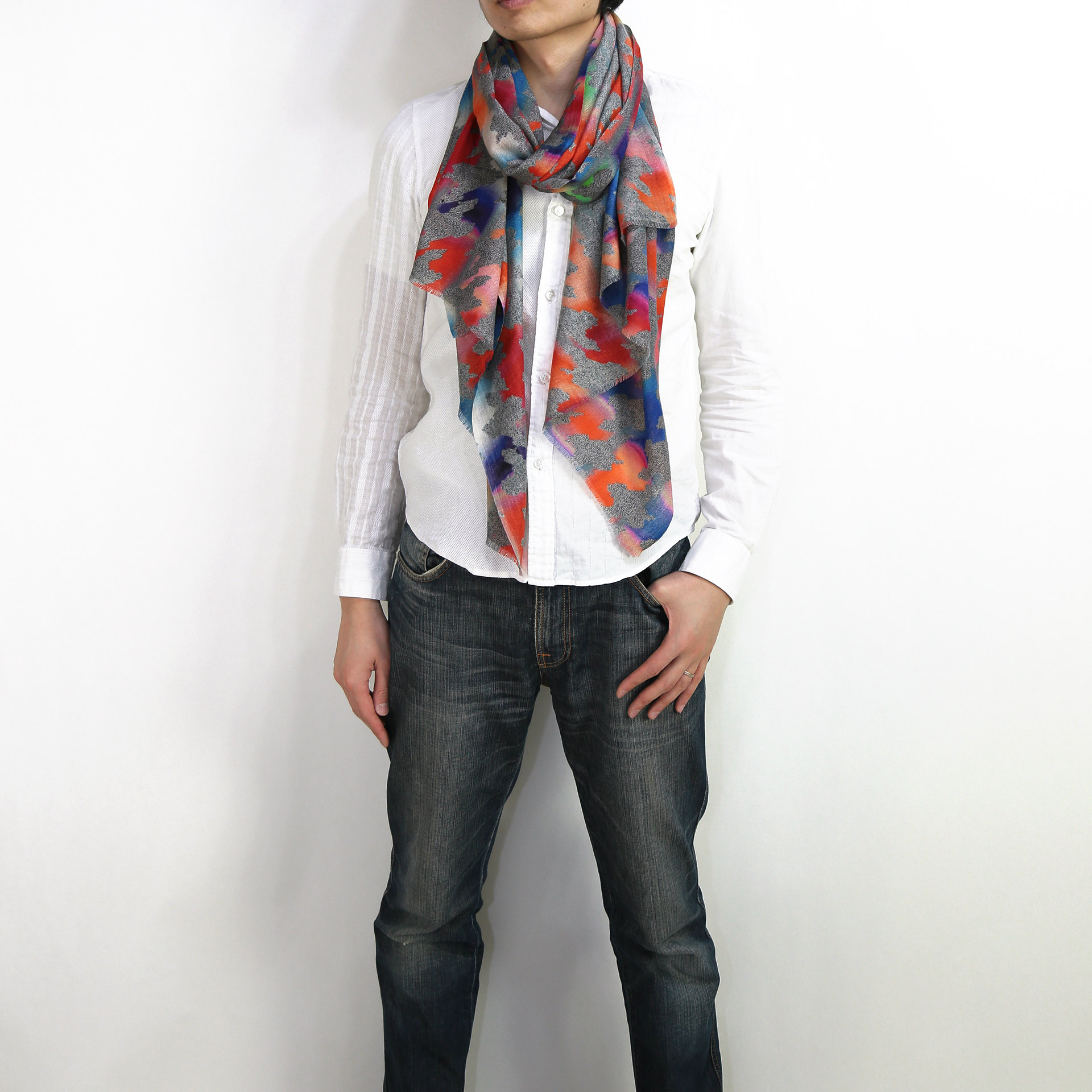 色と柄を掛け合わせてアクセントをつけた、大人の遊び心をくすぐるデザイン。こんなストールがあるとカジュアルは面白くなります!