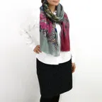 シックな花柄が効いた高級感あふれるデザイン。落ち着いたトーンで着まわしやすいアクセントストールです。