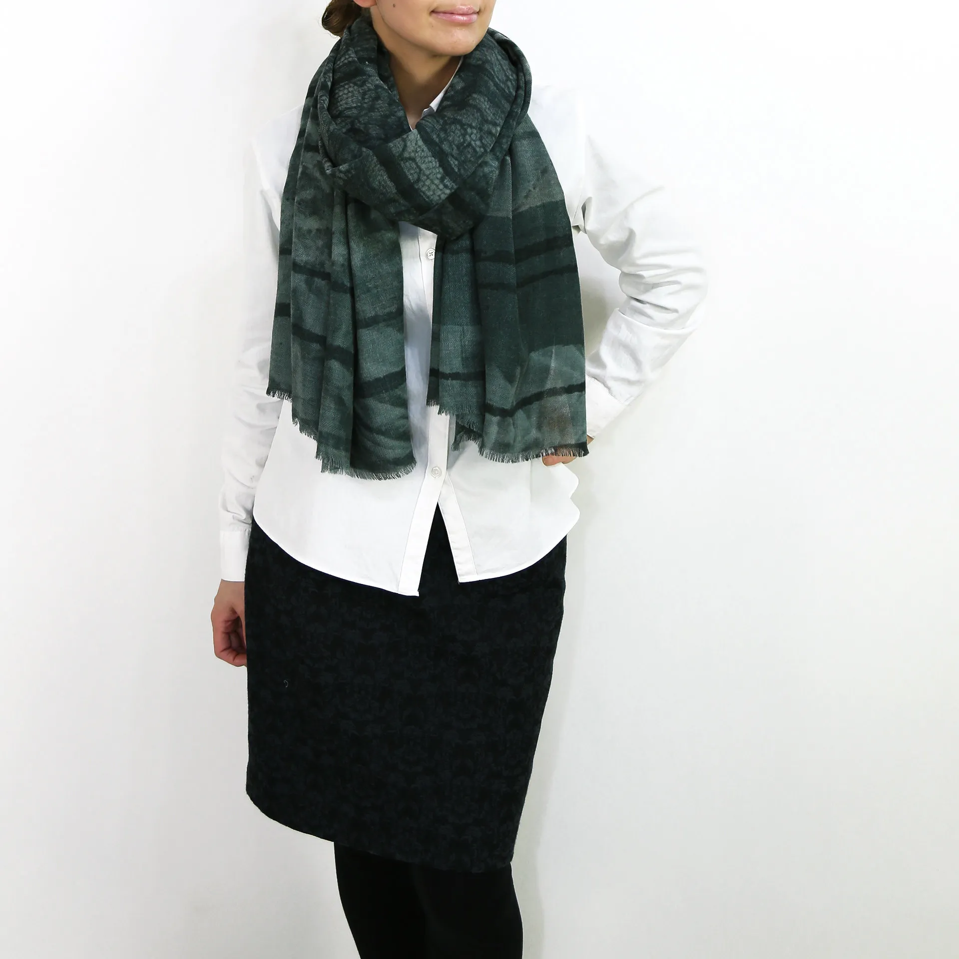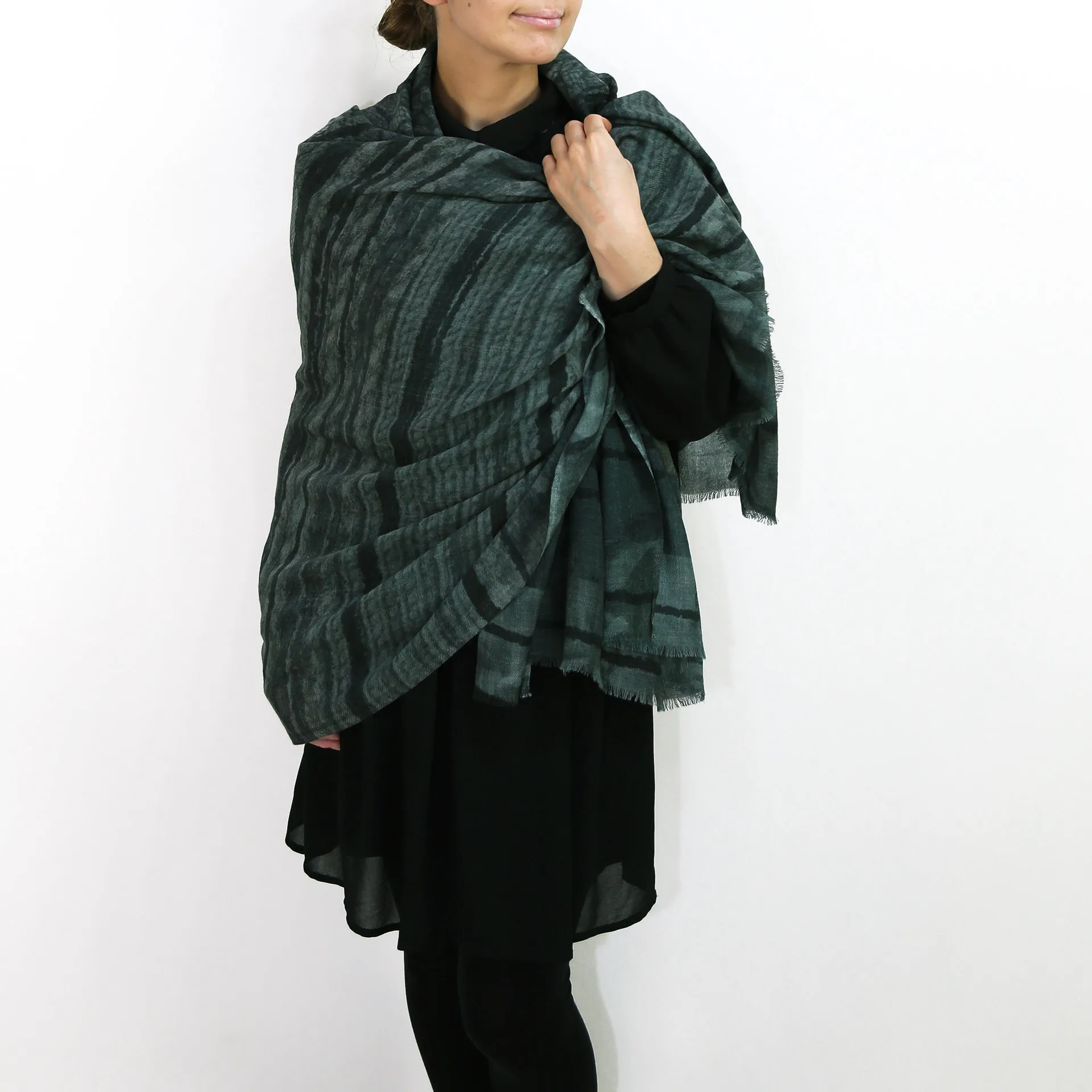 非常に大きなショールサイズで、広げて羽織れば上半身をすっぽりと覆うことができます。縦横の長さも十分にあるため、巻き方の自由度が広がります。程よいボリューム感と立体感を簡単につくることができるため、一巻きでこなれた印象になります。面積もあるので、真夏の室内での冷房対策や膝掛けとしても使いやすくなっています。