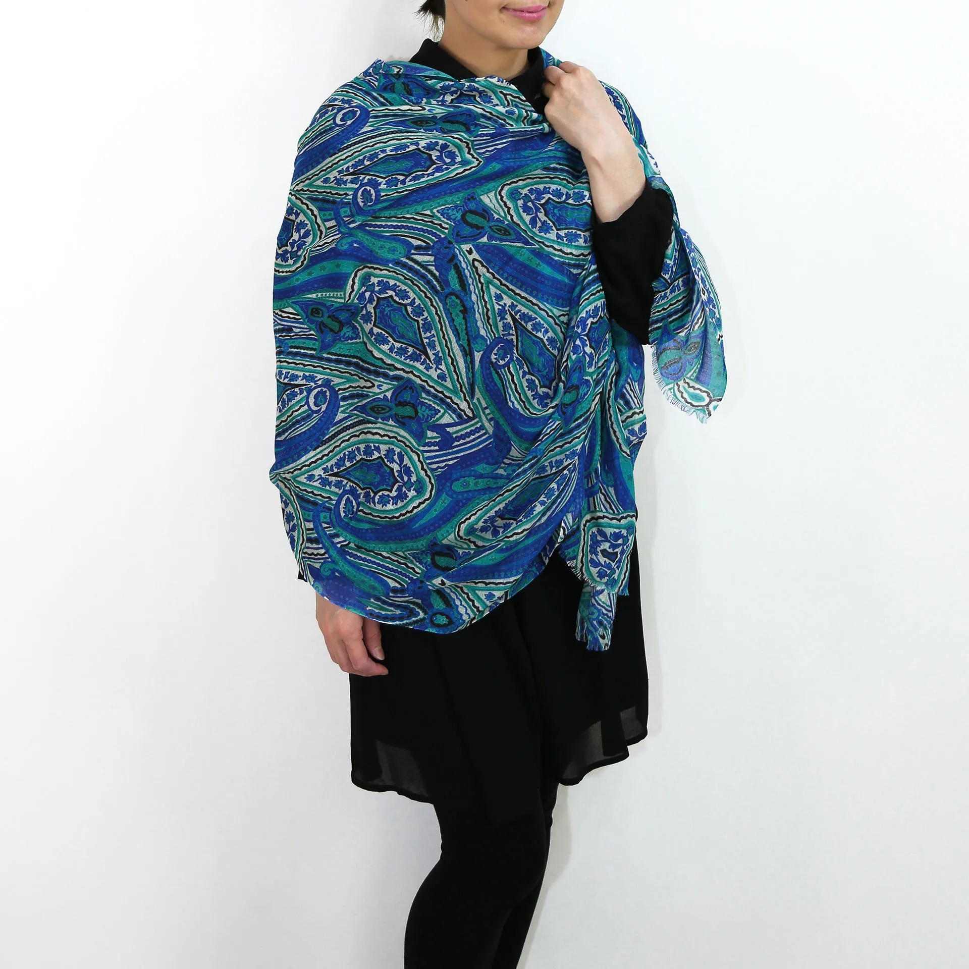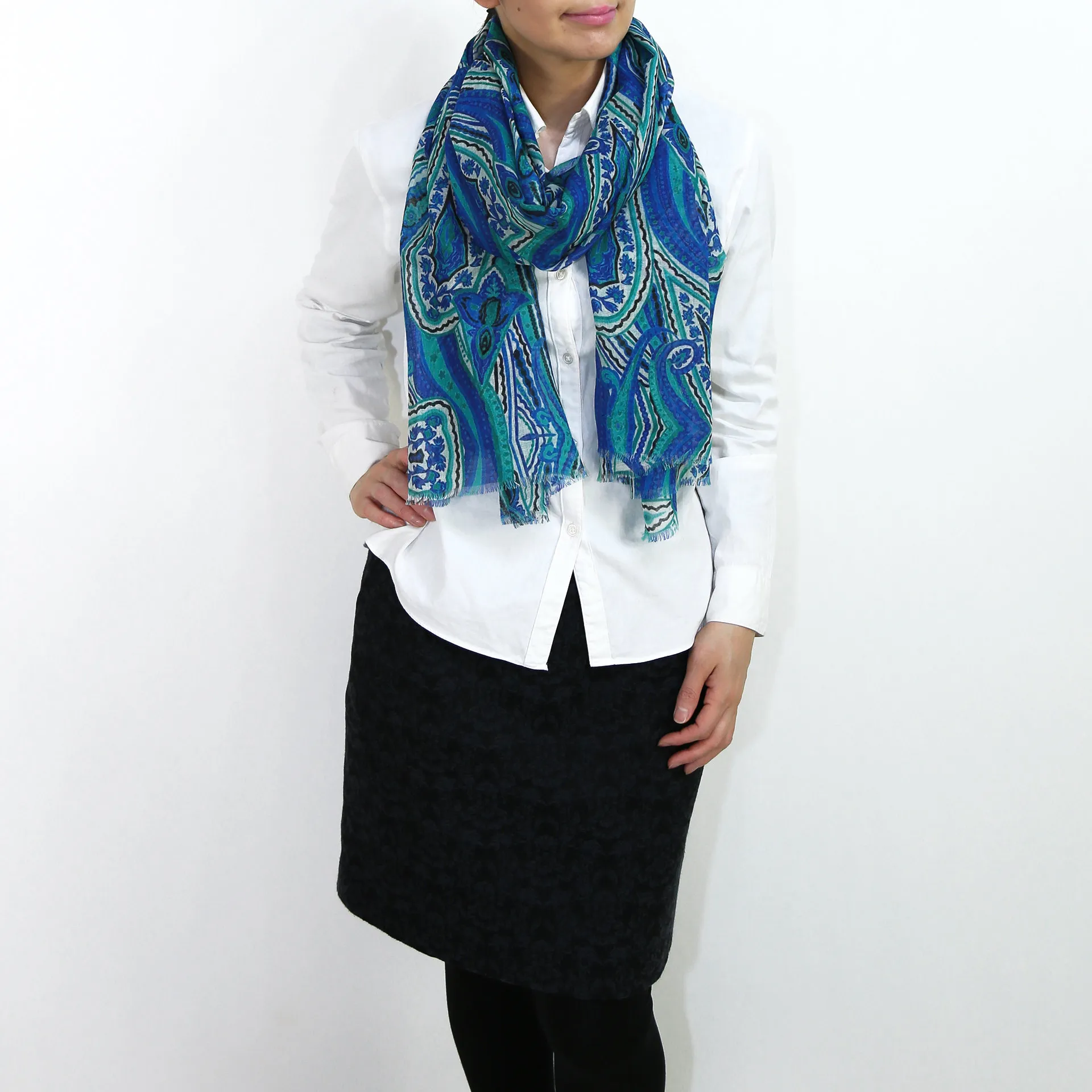 生地感よりカジュアルな普段使いにも、少しフォーマルなシーンでも使いやすいタイプです。スタイルや場所を問わず合わせることができる優れたストールです。
