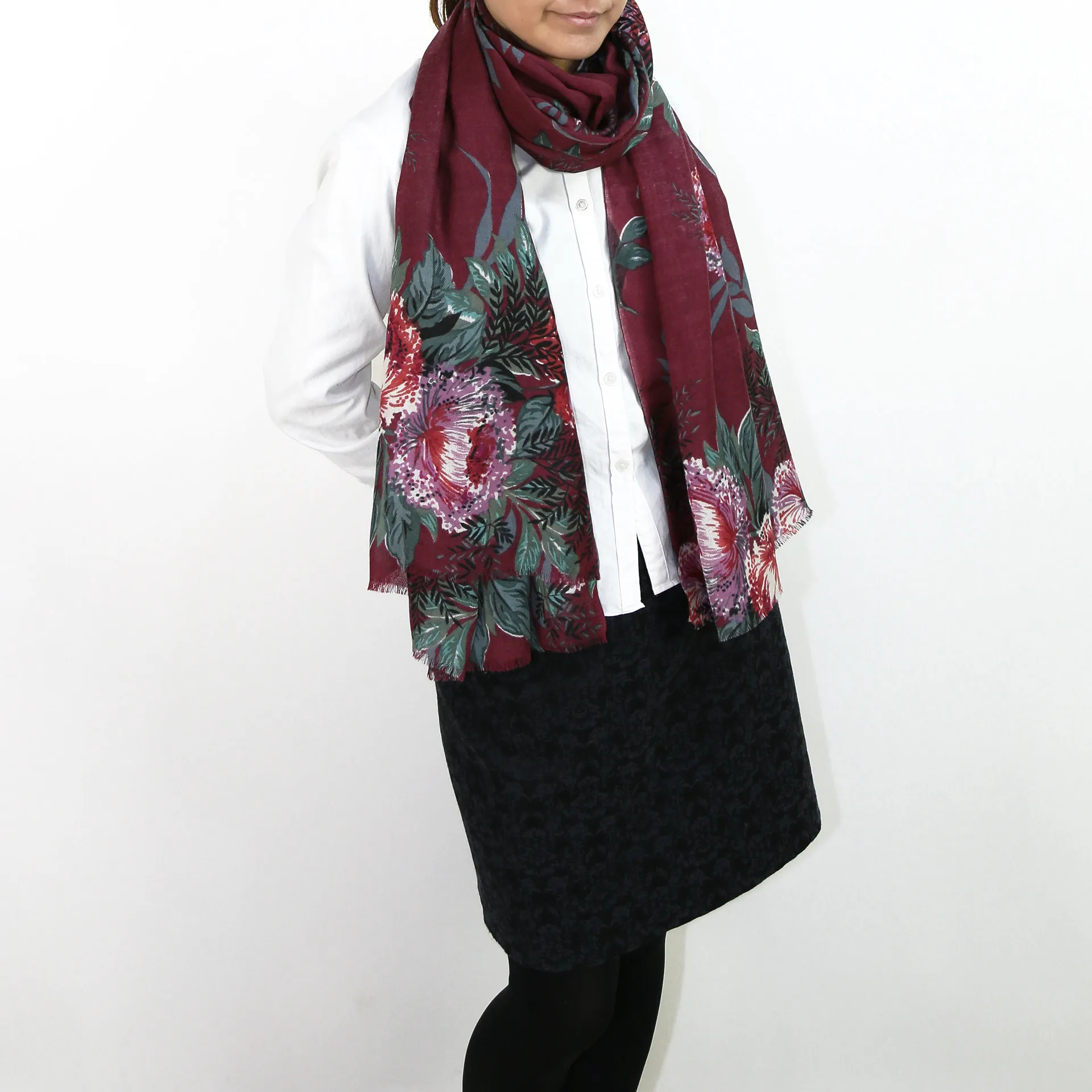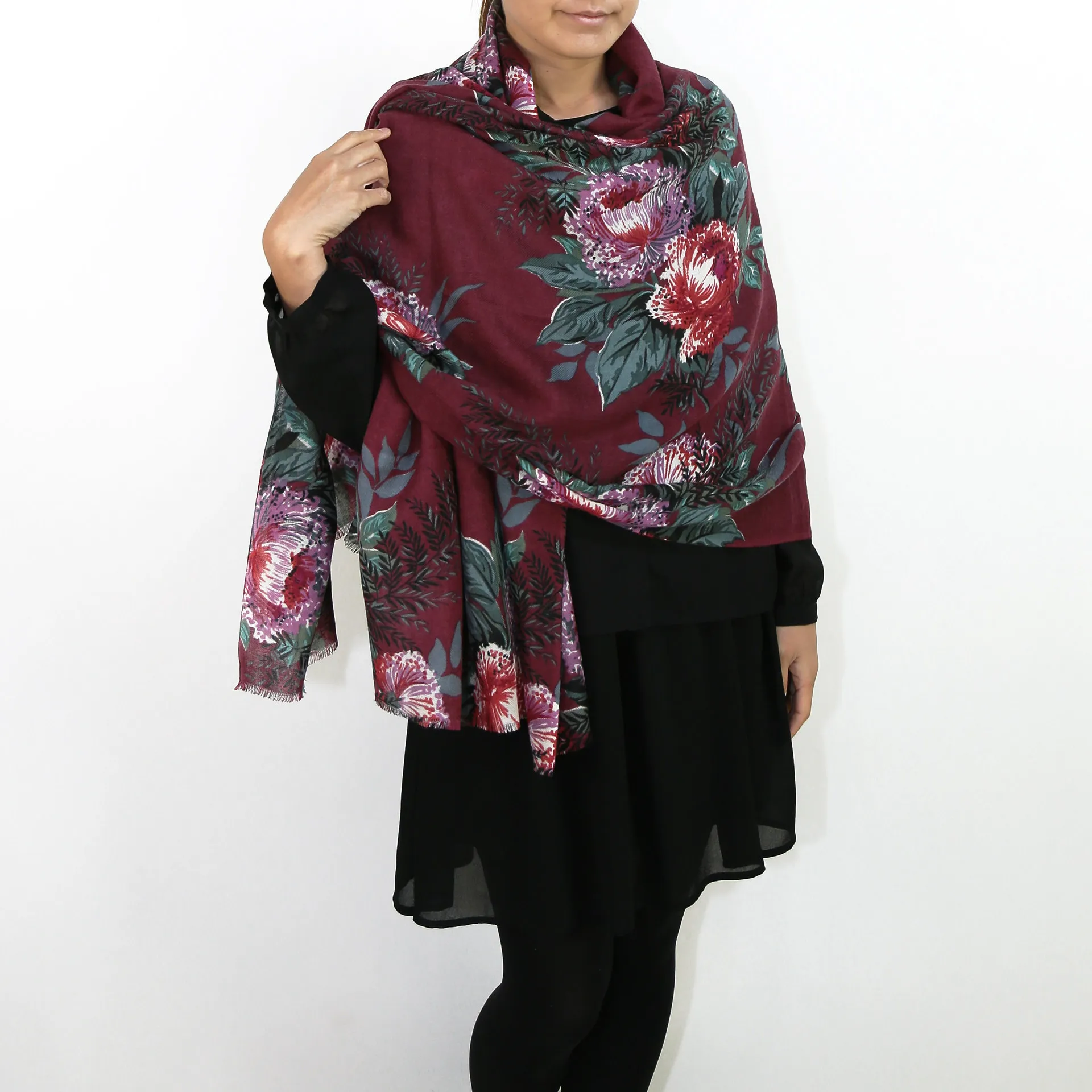 非常に大きなショールサイズで、広げて羽織れば上半身をすっぽりと覆うことができます。縦横の長さも十分にあるため、巻き方の自由度が広がります。程よいボリューム感と立体感を簡単につくることができるため、一巻きでこなれた印象になります。面積もあるので、真夏の室内での冷房対策や膝掛けとしても使いやすくなっています。