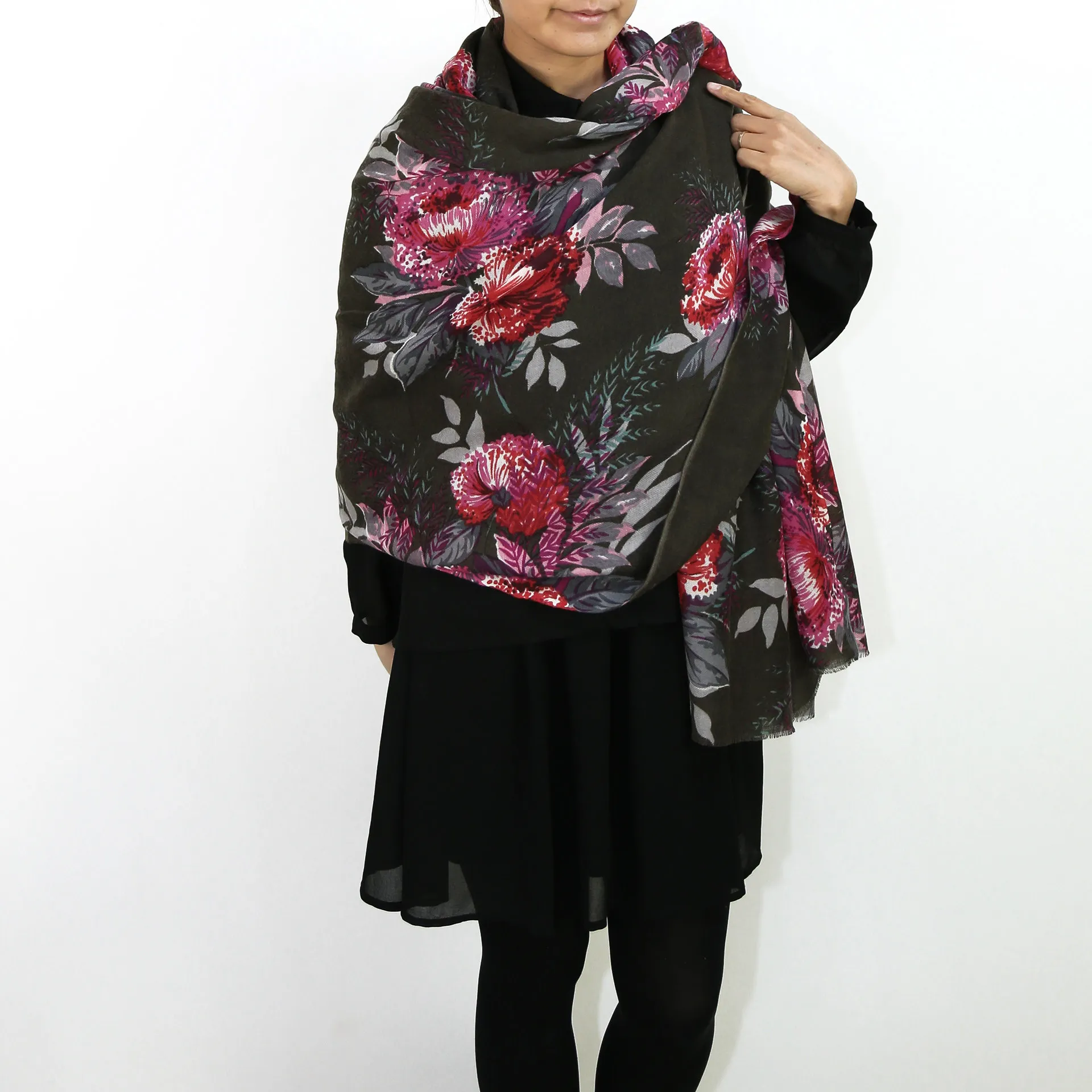 非常に大きなショールサイズで、広げて羽織れば上半身をすっぽりと覆うことができます。縦横の長さも十分にあるため、巻き方の自由度が広がります。程よいボリューム感と立体感を簡単につくることができるため、一巻きでこなれた印象になります。面積もあるので、真夏の室内での冷房対策や膝掛けとしても使いやすくなっています。