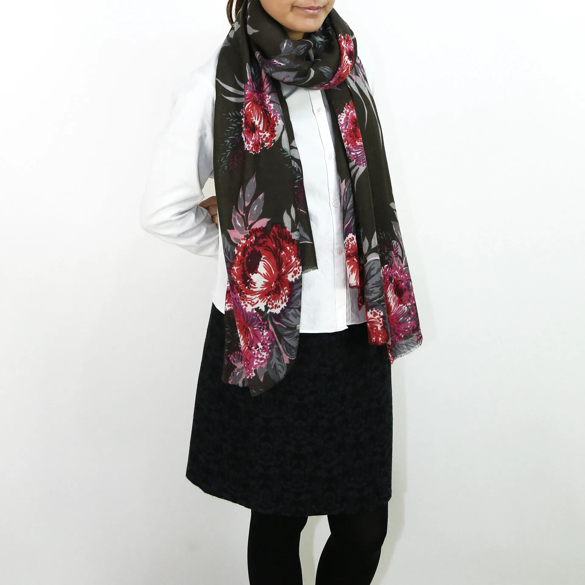 生地感よりカジュアルな普段使いにも、少しフォーマルなシーンでも使いやすいタイプです。スタイルや場所を問わず合わせることができる優れたストールです。