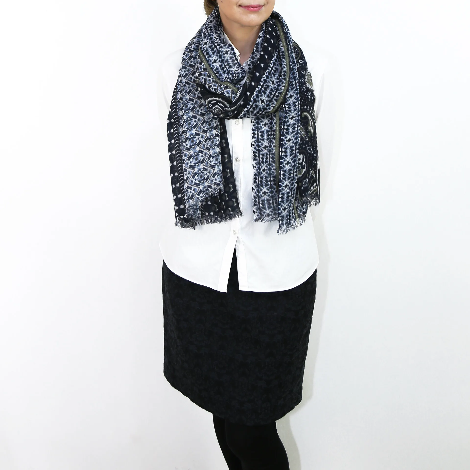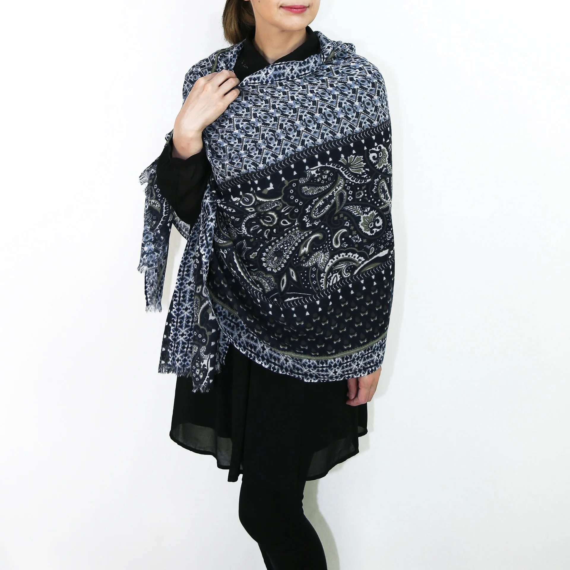 スタンダードな大判サイズで、秋冬だけでなく春までしっかり活躍します。また、真夏の室内での冷房対策としても使いやすくなっています。複雑な巻き方でも取り回ししやすく、さまざまな巻き方でおしゃれを楽しめます。