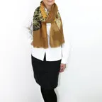 インパクトのあるモチーフが描かれたデザイン。ダイナミックな柄ですが、実際に巻くと想像以上に合わせやすい一枚です。