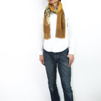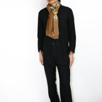 インパクトのあるモチーフが描かれたデザイン。ダイナミックな柄ですが、実際に巻くと想像以上に合わせやすい一枚です。