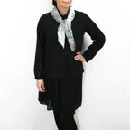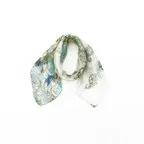 小ぶりなスクエアサイズで、アスコットタイのようにシャツやブラウスの中におさめて使うこともできます。室内でも巻いたままでいられるので使いやすくなっています。