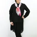 小ぶりなスクエアサイズで、アスコットタイのようにシャツやブラウスの中におさめて使うこともできます。室内でも巻いたままでいられるので使いやすくなっています。
