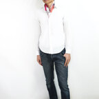 小ぶりなスクエアサイズで、アスコットタイのようにシャツやブラウスの中におさめて使うこともできます。室内でも巻いたままでいられるので使いやすくなっています。