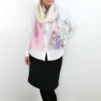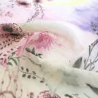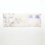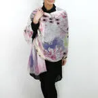 淡く透明感のある色使いとデザイン性の高いアシンメトリーモチーフが描かれた他にはないリネンストール。纏うだけで全体の印象を大きく変えてくれます。