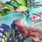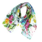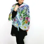 明るい陽射しに似合う、ほんのり肌が透けるほど薄手のコットンストール。ふんわり揺れるカラフルな花柄が大人にちょうどいい甘さです。