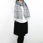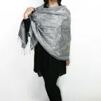 スタンダートな大判サイズで巻いても羽織っても、どちらも使いやすいタイプです。特に羽織は全体の印象がパッと華やかに、エレガントな雰囲気に変化します。