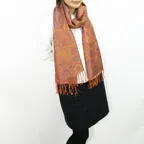 スタンダートな大判サイズで巻いても羽織っても、どちらも使いやすいタイプです。特に羽織は全体の印象がパッと華やかに、エレガントな雰囲気に変化します。