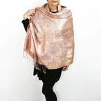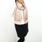 スタンダートな大判サイズで巻いても羽織っても、どちらも使いやすいタイプです。特に羽織は全体の印象がパッと華やかに、エレガントな雰囲気に変化します。