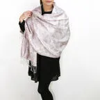 スタンダートな大判サイズで巻いても羽織っても、どちらも使いやすいタイプです。特に羽織は全体の印象がパッと華やかに、エレガントな雰囲気に変化します。