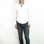 小ぶりなスクエアサイズで、アスコットタイのようにシャツやブラウスの中におさめて使うこともできます。室内でも巻いたままでいられるので使いやすくなっています。