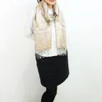 スタンダートな大判サイズで巻いても羽織っても、どちらも使いやすいタイプです。特に羽織は全体の印象がパッと華やかに、エレガントな雰囲気に変化します。