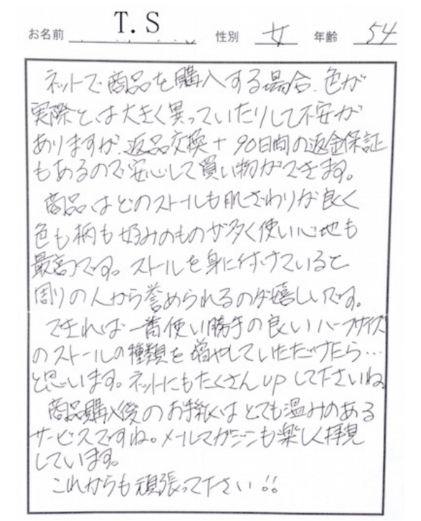ネットで商品を購入する場合、色が実際とは大きく異なったりして不安がありますが、返品交換+90日間の返金保障があるので安心して買い物ができます。 商品はどのストールも肌触りが良く色も柄も好みのものが多くつかい心地も最高です。... ストールを身につけていると周りの人から褒められるのが嬉しいです。 ネット販売ですので自分に似合っているかどうかもチェックできないし、肌触りや色味も思っていた物と違うかもしれないという不安はありますが、メールでいつでも雑談できますし、返品・交換も快よく受け付けてもらえるので助かります。 …