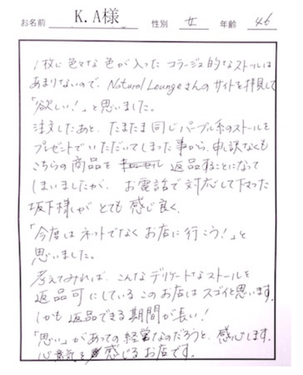 注文したあと、たまたま同じパープル系のストールをプレゼントでいただいてしまった事から、申し訳なくもこちたの商品を返品することになってしまいましたがお電話で対応して下さった坂下様がとても感じよく、「今度はネットではなくお店にいこう!」とおもいました。