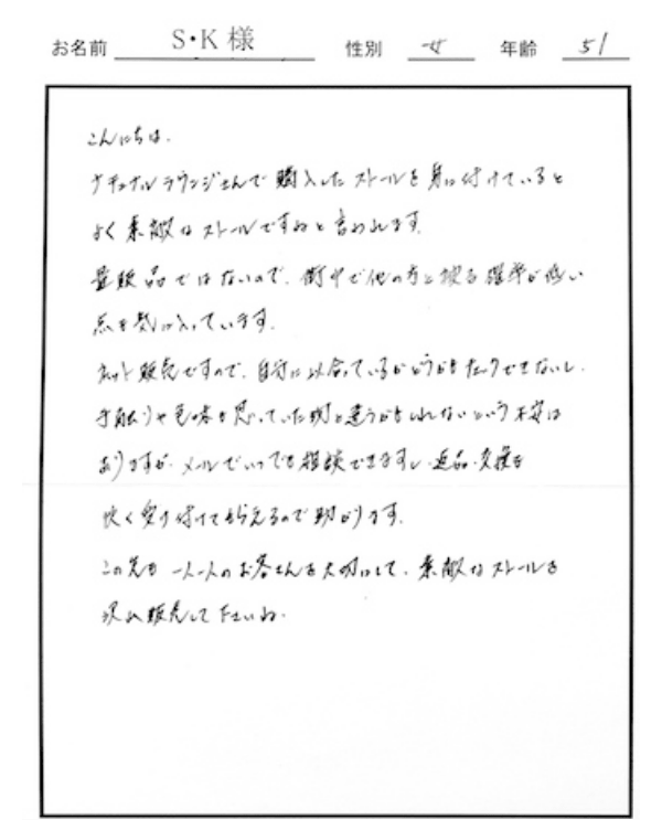 量販品ではないので、街中で他の方と被る確率が低い点も気に入っています。 ネット販売ですので自分に似合っているかどうかもチェックできないし、肌触りや色味も思っていた物と違うかもしれないという不安はありますが、メールでいつでも雑談できますし、返品・交換も快よく受け付けてもらえるので助かります。