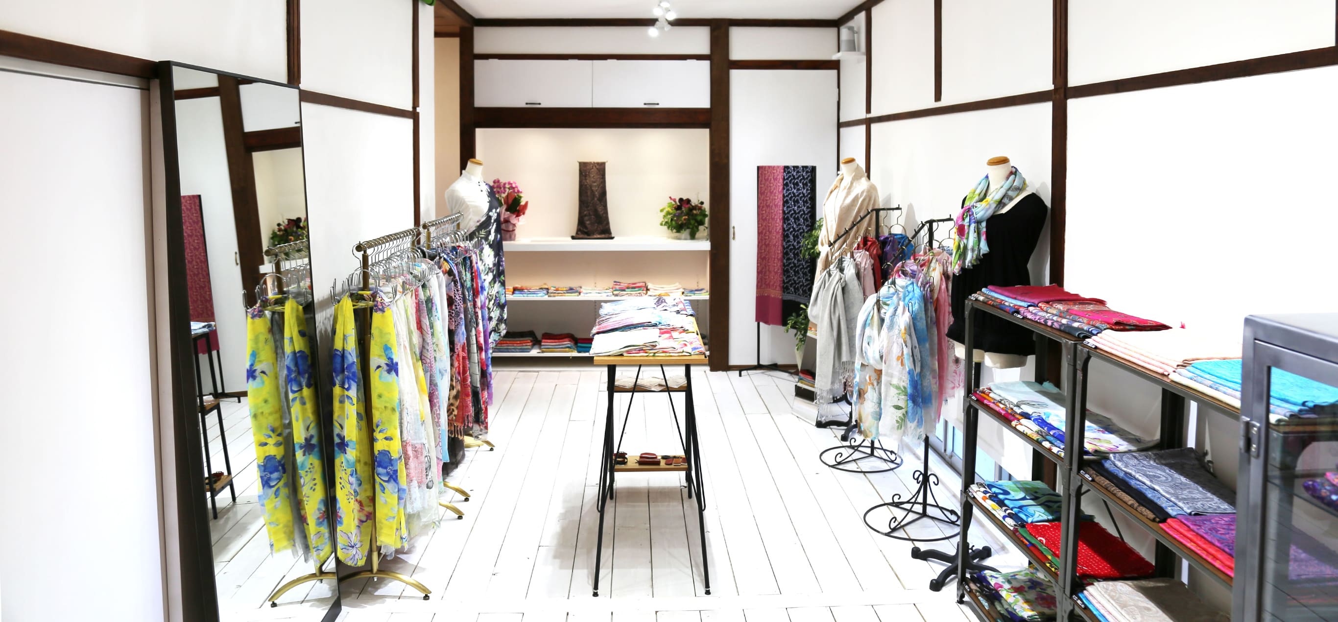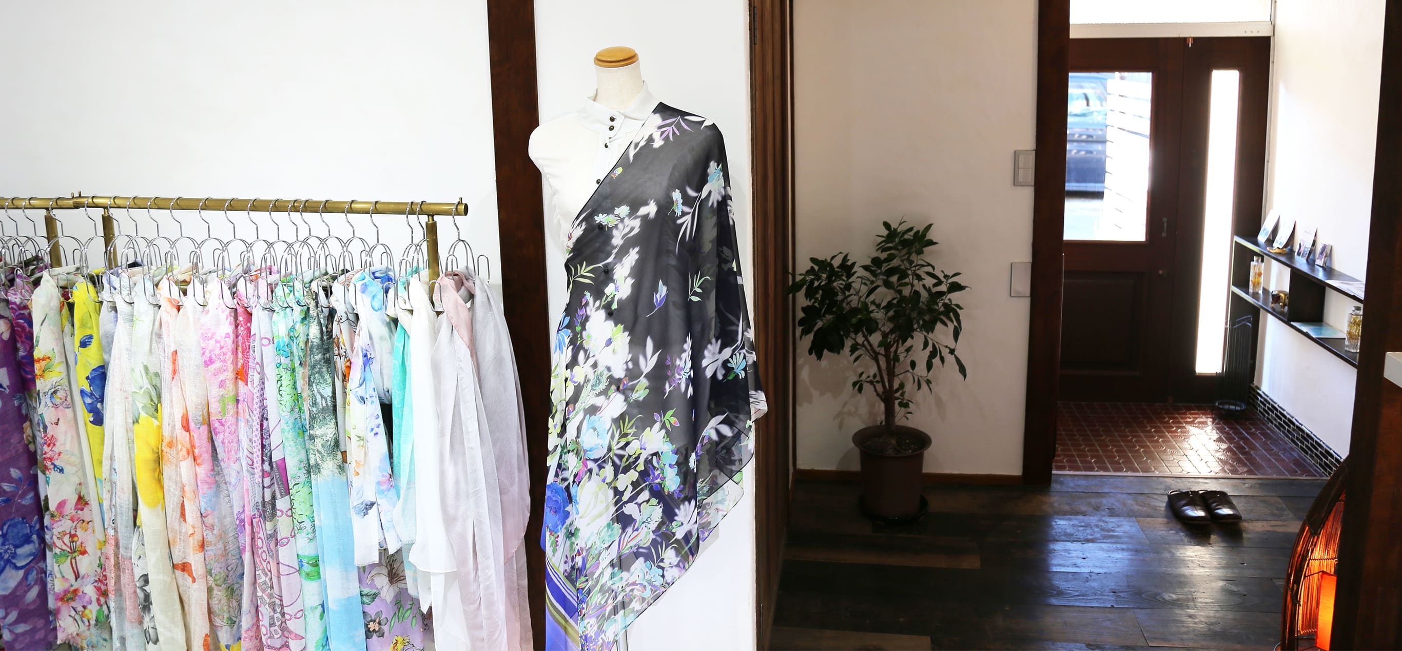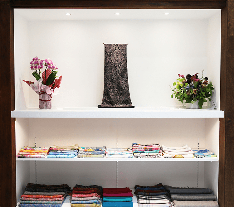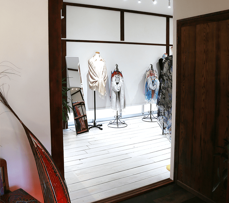 静かでゆったりとした空間でたくさんの種類のストールをご覧いただけます。もちろん、ストールの巻き方やコーディネートのアドバイス、大切な方へのプレゼント選びのお手伝いもさせていただきます。